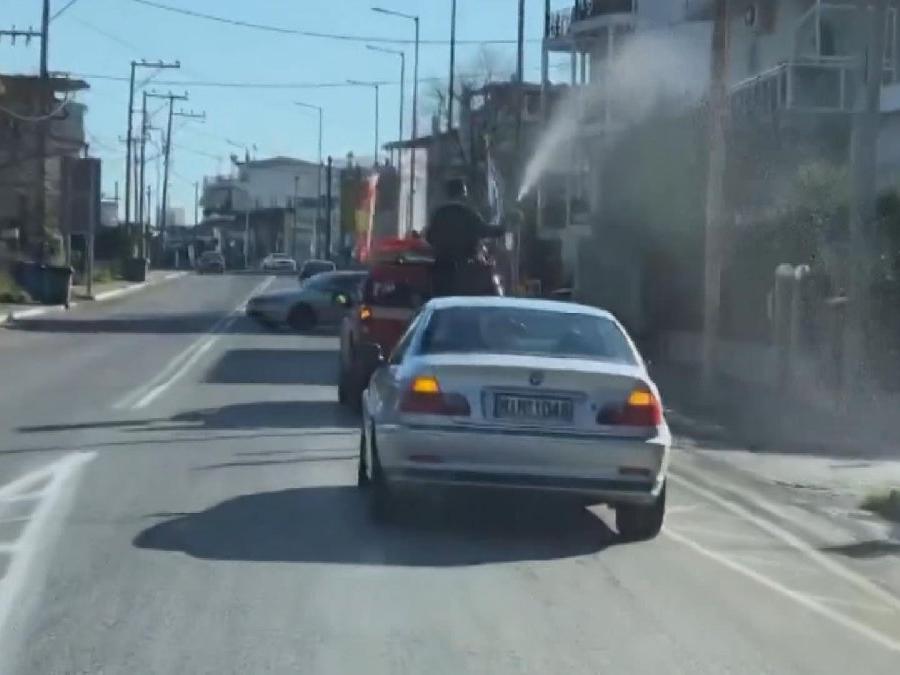 Yunanistan'ın Lianokladi köyünde bir papaz, halkı corona virüsü salgınından korumak gerekçesiye kamyonetin kasasında bulunan 15 litrelik kutsal su ile köyü kutsadı.