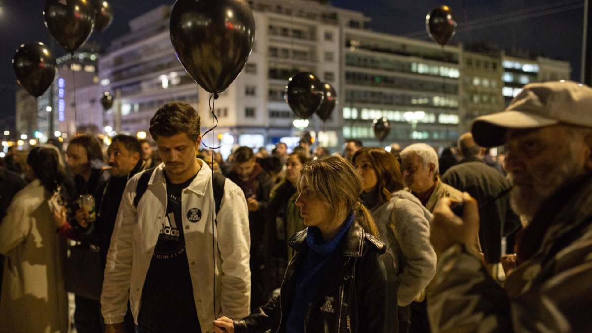 "Hellenic Train" ofisinin önüne kırmızı boyalarla "katiller" yazan eylemciler, ölenlerin hatırasına siyah pano ve siyah balonlar taşıdı.