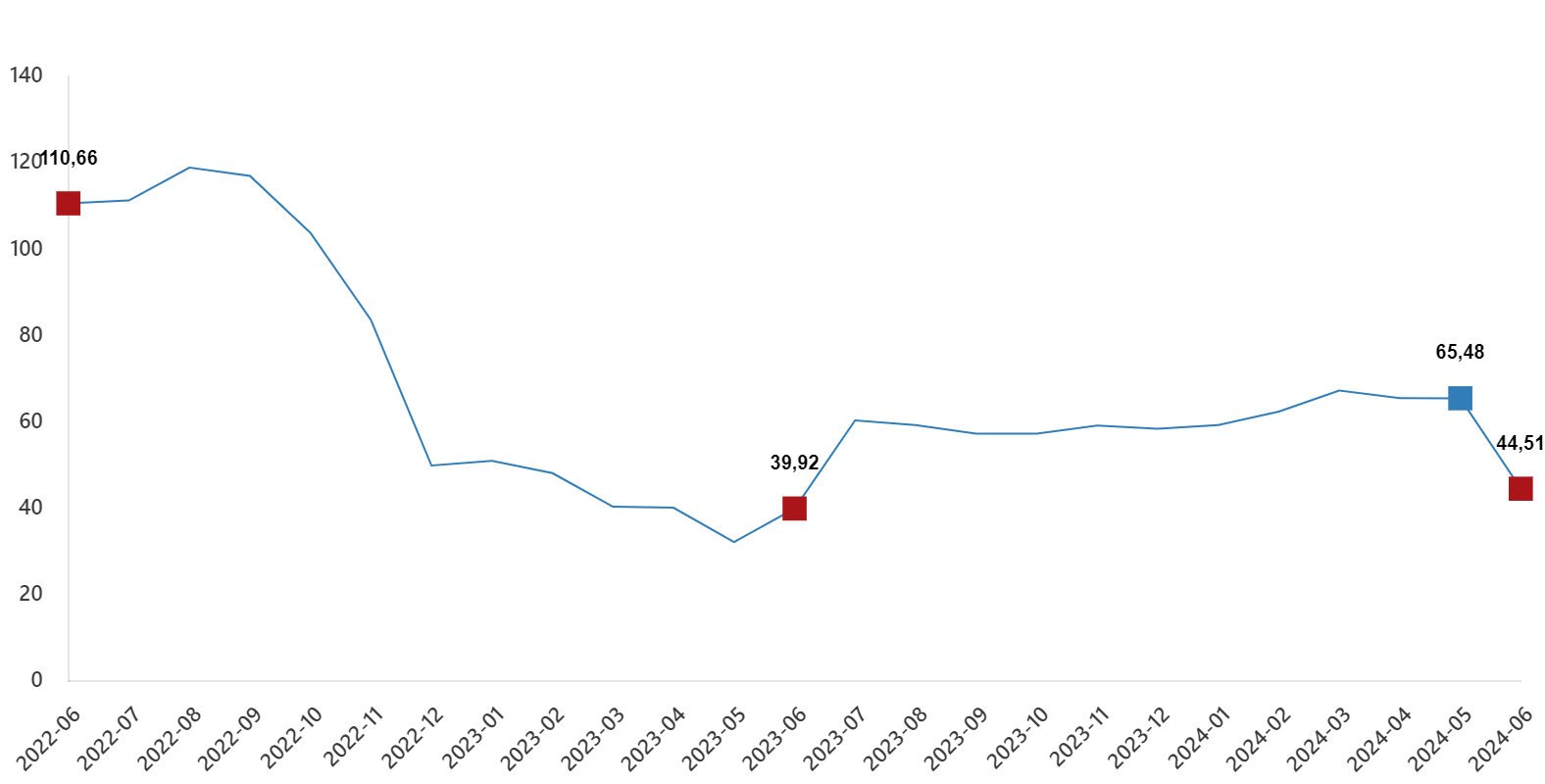 YD-ÜFE 2024 yılı Haziran ayında bir önceki aya göre yüzde 0,97 artış, bir önceki yılın Aralık ayına göre yüzde 15,22 artış, bir önceki yılın aynı ayına göre yüzde 44,51 artış ve on iki aylık ortalamalara göre yüzde 59,50 artış gösterdi.