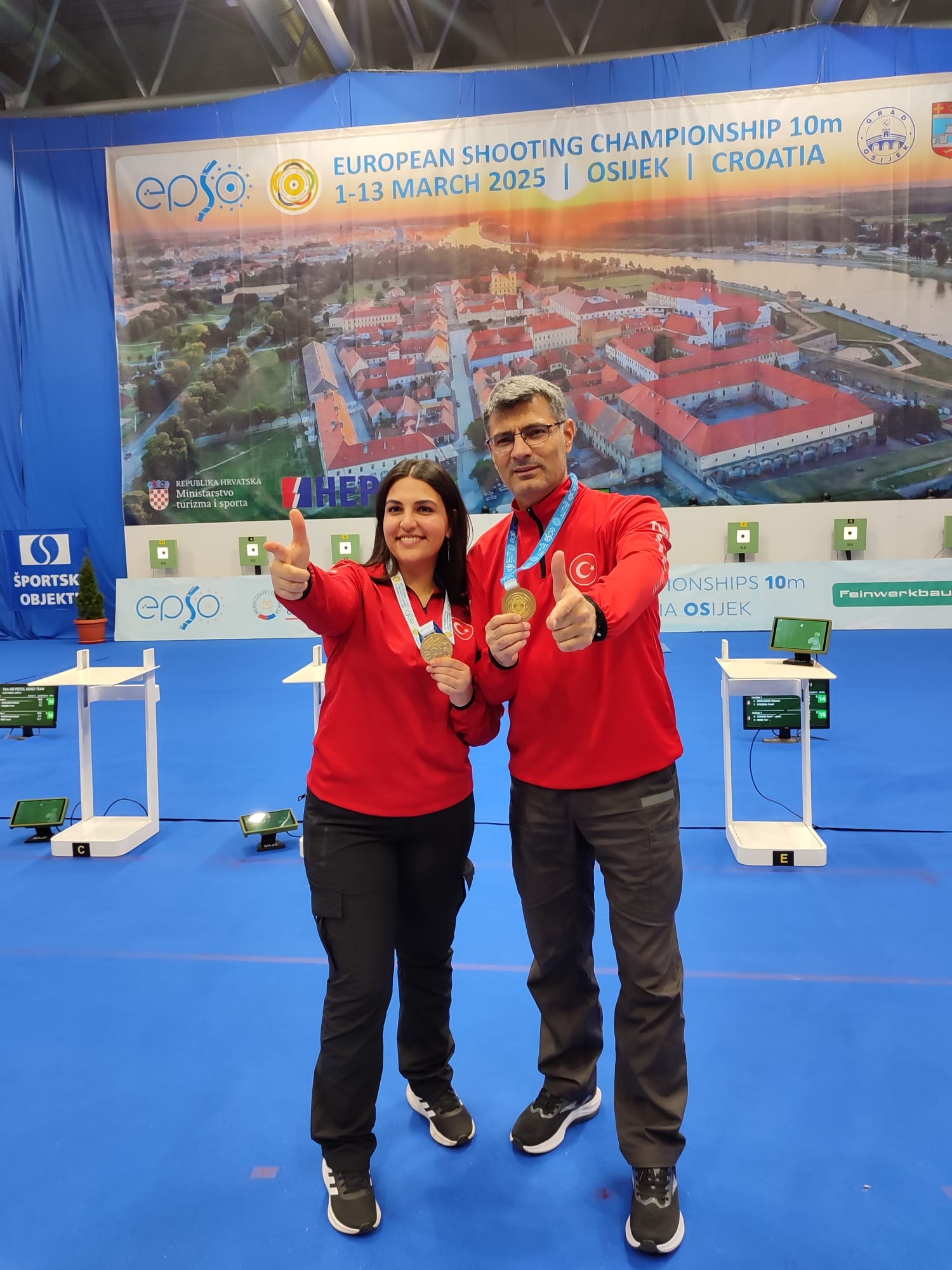 Yusuf Dikeç-Şevval İlayda Tarhan ikilisi, Hırvatistan'ın Osijek kentindeki organizasyonda 10 metre havalı tabanca karışık takım kategorisi finalinde Çek Viktorie Sindlerova-Pavel Schejbal çiftini 16-14 yenerek altın madalya aldı.