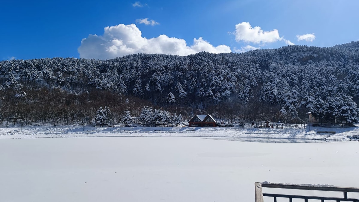 Doğaseverler, beyaz örtüyle kaplanan göl ve çevresinde hatıra fotoğrafı çektirdi.