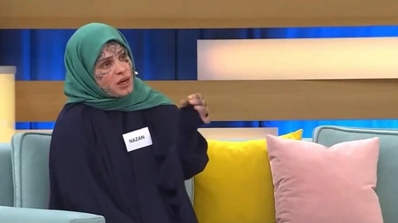 Sosyal medyada kurduğu ilişkinin maddi kayıpla sonuçlandığını anlatan kadının iddiaları kadar, yüzünün neredeyse tamamını kaplayan siyah dövmeleri de hem stüdyodakileri hem de ekran başındakileri şaşırttı.