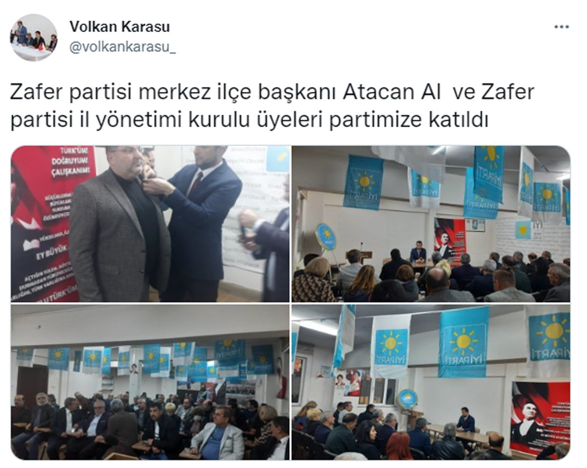 İYİ Parti Sivas İl Başkanı Volkan Karasu, sosyal medya hesabından istifa haberini duyurdu. Yapılan açıklamada, "Zafer Partisi merkez ilçe başkanı Atacan Al ve Zafer partisi il yönetimi kurulu üyeleri partimize katıldı" ifadelerine yer verildi.