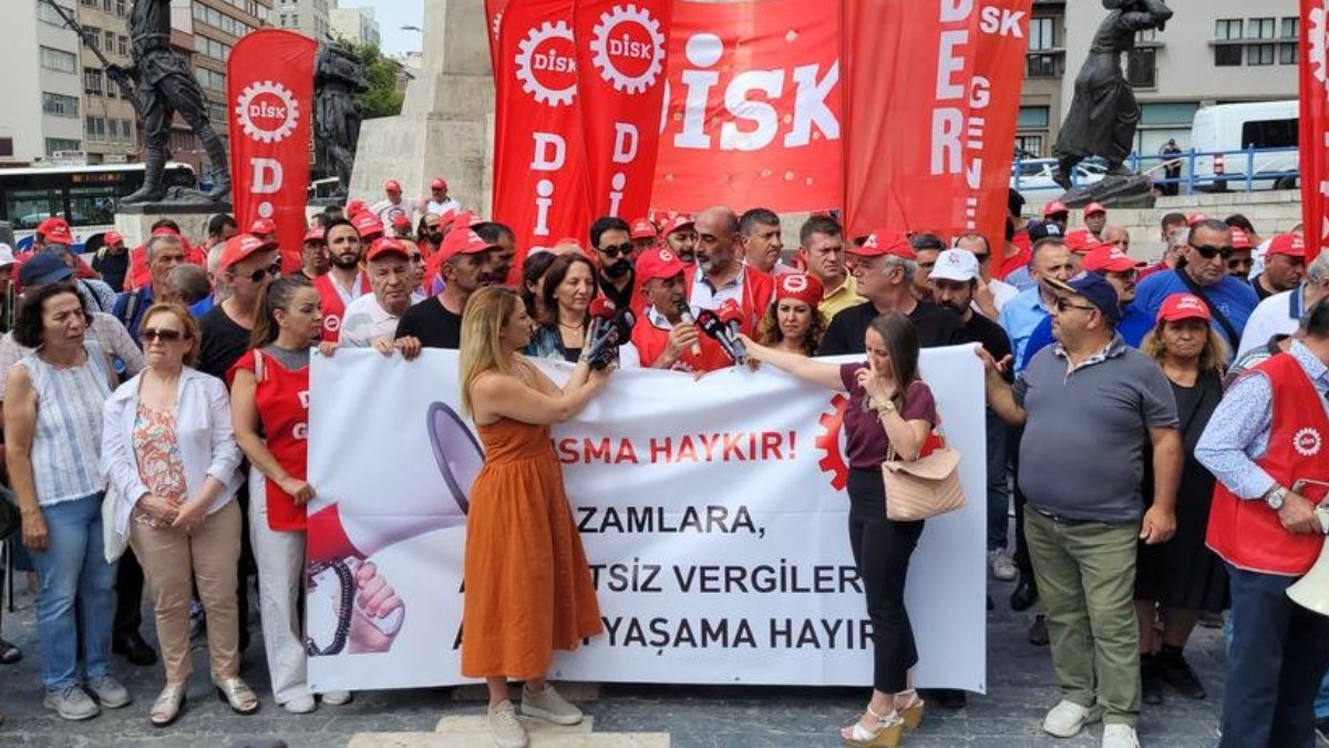 Türkiye Devrimci İşçi Sendikaları Konfederasyonu’na (DİSK) bağlı sendikaların üyeleri İzmir’de art arda gelen zamları ve vergileri protesto etti. Genel grev çağrısı yapan DİSK Ege Bölge Temsilcisi Memiş Sarı, “TÜRK-İş’e, Hak-İş’e, memur sendikalarına çağrı yapıyoruz; biz genel grevi, genel direnişi örgütlemeye hazır mıyız? Kendilerine sendika diyenlere çağrımız; genel grev, genel direniş” dedi.