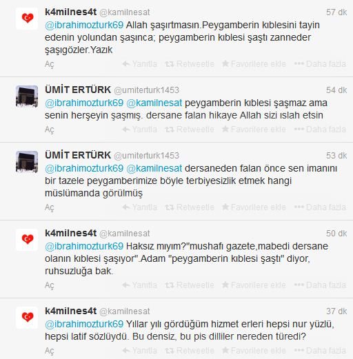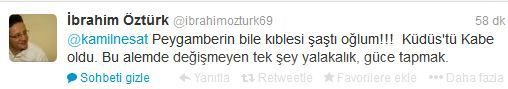 Öztürk'ün hesabından yazdığı twit şöyle: "Peygamberin bile kıblesi şaştı oğlum!!! Kudüs'tü Kabe oldu. Bu alemde değişmeyen tek şey yalakalık, güce tapmak."
