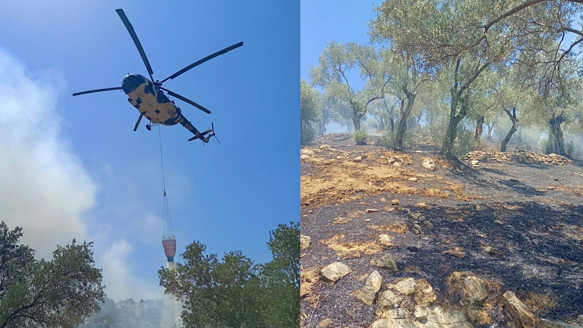 İlk belirlemelere göre 30 dönüm zeytinlik alan zarar görürken, soğutma çalışmaları sürüyor.