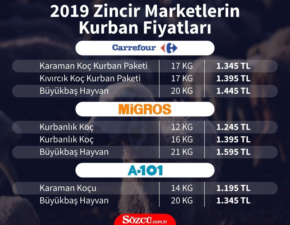 Firma, bu kapsamda en az 17 kilogramlık "Karaman Koç Kurban Paketi"ni bin 345 liradan, aynı ağırlıktaki "Kıvırcık Koç Kurban Paketi"ni bin 395 liradan satıyor. Büyükbaş kurbanlıkta ise en az 20 kilogramlık bir hissenin fiyatı bin 445 lira olarak belirlendi. CarrefourSA, geçtiğimiz yıl ise 16 kilogramlık kıvırcık koç kolisini 1.190 TL’den satışa çıkarmıştı.