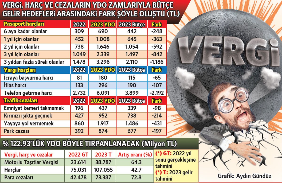 Bütçe verileri üzerinden SÖZCÜ’nün yaptığı hesaplamalara göre, önümüzdeki yıl pasaport harçlarının YDO kadar artırılması halinde örneğin 1 yıllık pasaport çıkarmanın maliyeti 452 liradan bin 8 liraya çıkacak. Ancak bütçedeki gelir hedefi bu tutarın 645 lira civarına indirileceğini işaret ediyor. Aynı şekilde B sınıfı ehliyet alanlar 2 bin 490 lira yerine bin 594 lira, aracını yanlış yere park edenlere kesilecek ceza da 874 lira yerine 677 liraya düşürülecek. Ancak seçim de dikkate alındığında bu zamların daha da aşağı çekilmesi sürpriz olmayacak.