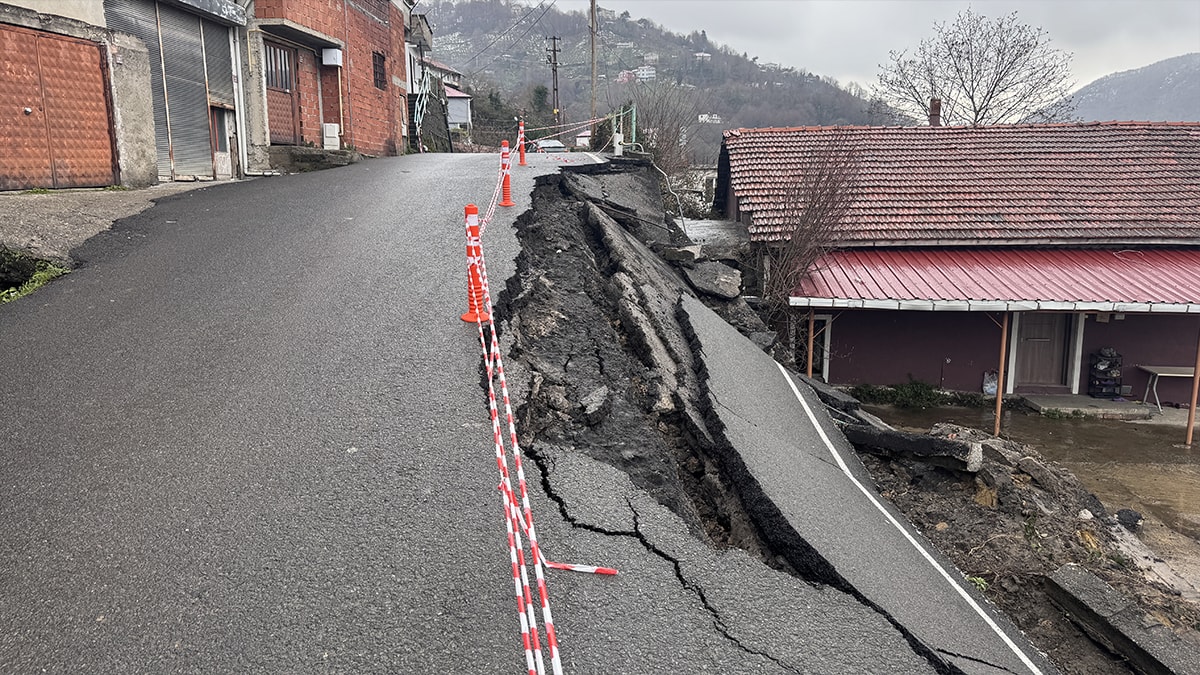 Günlerdir etkili olan yağmur ve karın erimesiyle meydana gelen heyelanda yolun bir bölümünde çökme yaşanırken, beton parçaları yol kenarındaki bir evin önüne düştü.