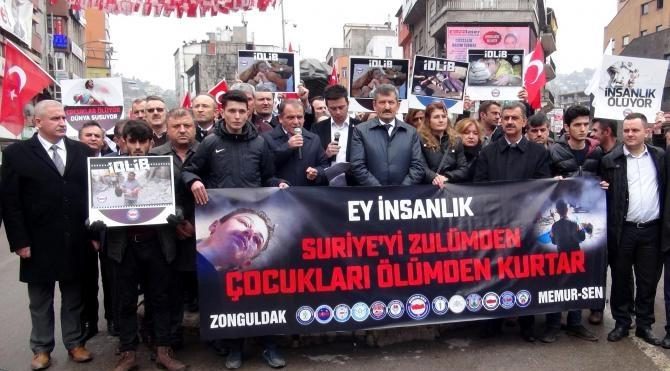 Memur- Sen Zonguldak İl Temsilciliği’nce Madenci Anıtı’nda yapılan basın açıklamasına 150 kişi katıldı. Kalabalık, 'Ey insanlık Suriye’yi zulümden çocukları ölümden kurtar' yazılı pankart açarken, İdlib’te kimsayal saldırıdan etkilenen çocukların larını taşıdı.