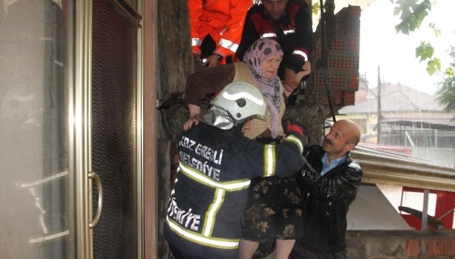 İtfaiye ekiplerinin başlattığı kurtarma çalışması sonrasında 70 yaşında ki Zeynep Erol isimli yaşlı kadın mahsur kaldığı evden kurtarıldı.
